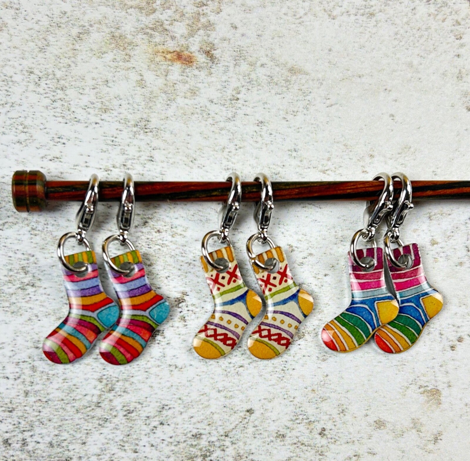 These crochet stitch markers are 1.5cm x 2cm – Sock shaped and feature two each of three designs (six in total) artwork by Emma.