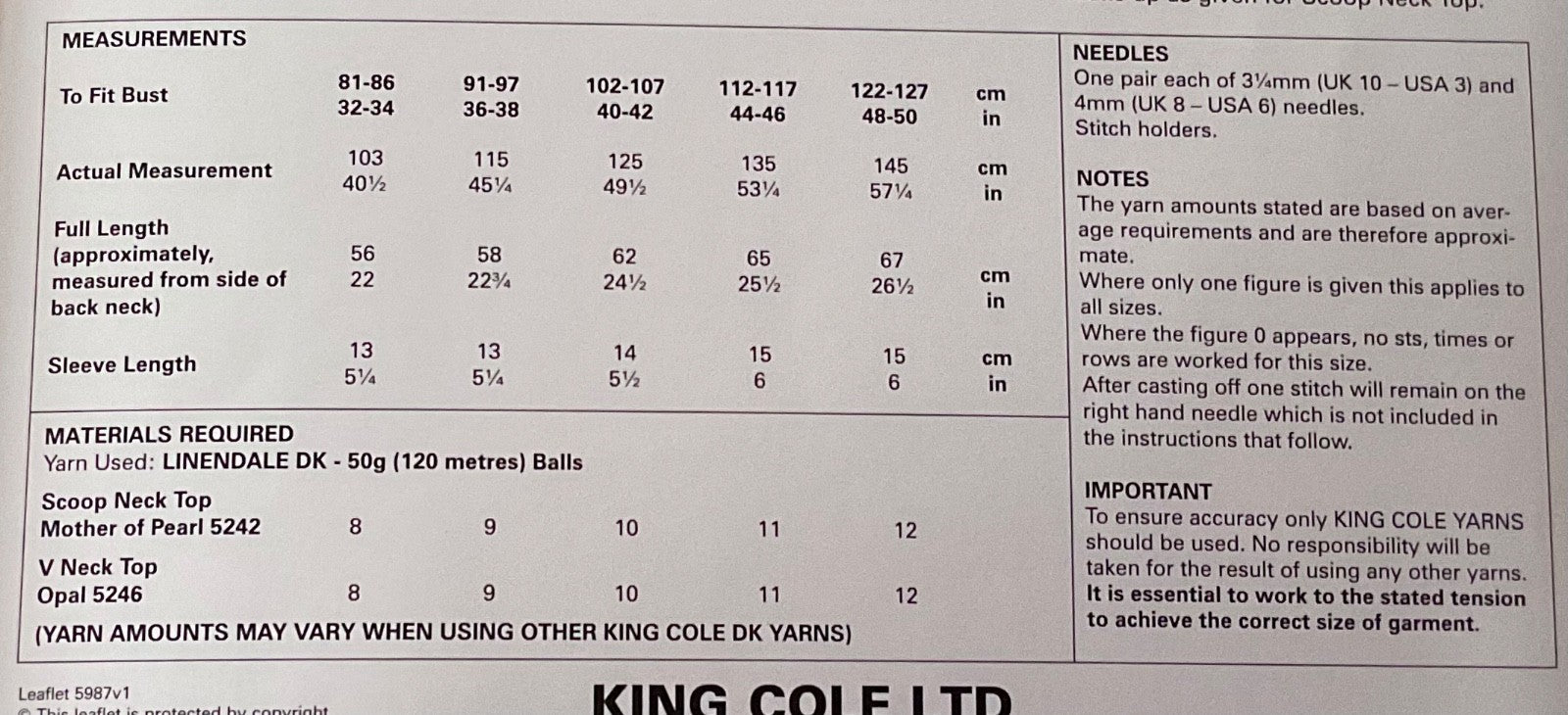 King Cole DK knitting pattern 5987 - Ladies Tops in Linendale DK - 32-50 ins